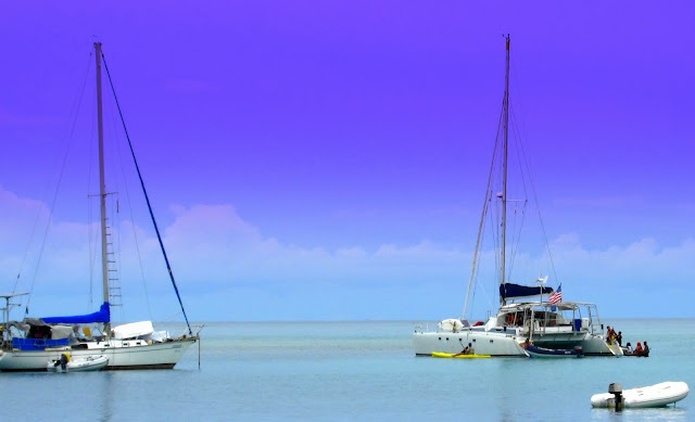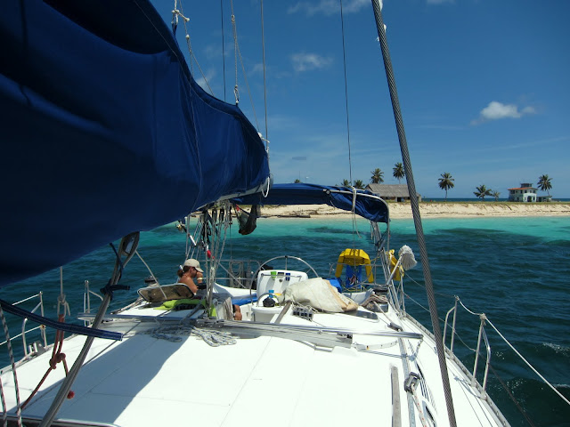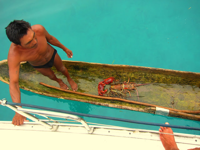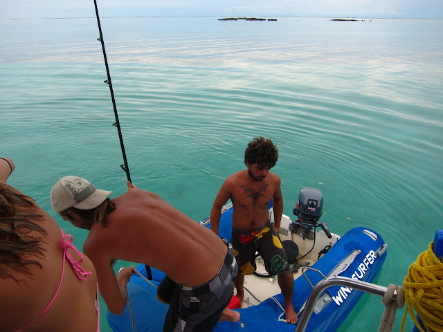 Parfois un sursaut et l'envie de manger nous prend. Alors Tilson et Nick tentent de partir pêcher mais finalement le seul appât qui fonctionnera sera un billet de 5 dollars avec lequel ils achèteront du poisson déjà pêché. On tente de temps en temps de lancer une ligne depuis le bateau pour ramener quelques poissons en plus et on tente même de pêcher un énorme baracouda qui passe sous le bateau. Il nous mange deux lignes et file à la vitesse de la lumière. Nick dans l'eau à ce moment là pour le voir de plus prêt se demande ce qu'il fout face à se monstre qui mange des hameçons pour le petit déjeuner. On achète aussi des langoustes et on se fait tous les repas qu'on aime. Mexicain, créole pour notre plus grand plaisir. Un requin chat passe sous le bateau, un petit requin inoffensif qui oscille sous nos yeux. C'est pas le premier qu'on voit, mais c'est le premier vivant en tout cas.