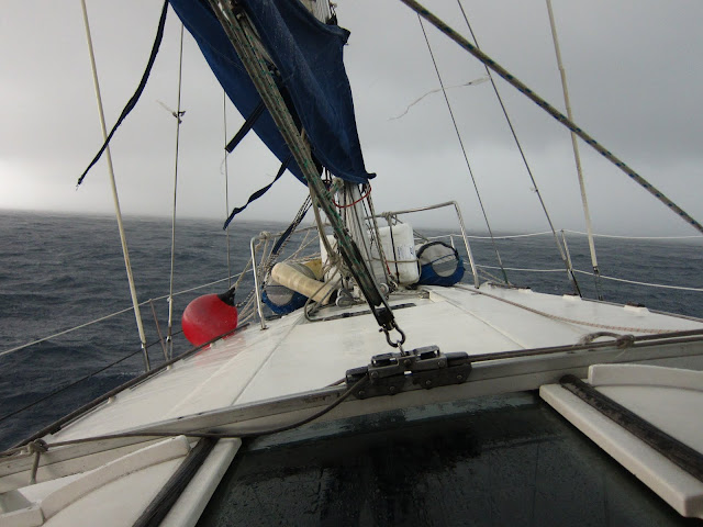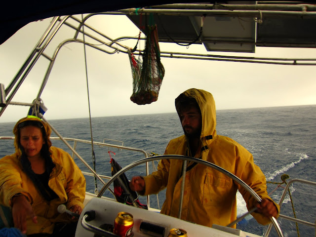 Enfin on prend la mer et partons au large, la mer est calme et le soleil présent pour une fois. Mais l'apparent beau temps sera de courte durée. Alors qu'on s'apprêtait à préparer les spaghettis bolognaise, la pluie et le vent se levèrent, puis alors qu'on magnait les casseroles, les visages se figèrent, les casseroles se tenèrent à 45 degrès pour ne pas les renverser, le capitaine se battait avec la barre (qu'on appelle un macaron) pour redresser le bateau et sa copine se démenait avec les cabestans où s'enroullent les cordes qui commandent les voiles. Il était 16h. En quelques seconde la mer se démontait et on se tenait tant bien que mal en équilibre dans la cabine qui nous balançait tantôt à babord et à tribord. Deux prirent des pilules contre le mal de mer de suite ce qui les firent dormirent pendant 15h, les autres filèrent sur le pont pour prendre l'air et anticiper les vagues; L'intérieur du bateau valdinguant, on se sentait dedans comme dans un bateau ivre. Donc trempés, les corps au vent et sous la pluie, on regardait les vagues qui malmenaient notre voilier. Tout autour, du gris et du gris, la tempête n'avait pas l'air de vouloir se calmer. Je tentais de rassurer Nora qui se sentait mal en lui disant de regarder l'horizon et que la tempête n'allait durer qu'une heure, n'en sachant rien, mais une heure en mer sur une mer houleuse, ça en vaut 5 sur terre. Finalement une heure après la mer se calma relativement et même si les vagues continuaient à soulever le bateau, c'était pour nous comme naviguer en eau calme. Moment pour se relaxer, de faire quelques mots croisés et de se réchauffer et surtout de finir de cuisiner nos spaghettis au chorizos et de manger. On mangeait dehors à la fraîche et on s'endormit dehors au grand air pour éviter nos lits encore ivre à l'intérieur. Mais la pluie nous chassa et au milieu de la nuit chacun regagna sa couche. Je fus le dernier à rentrer, bien après Nora, bien après Nick que je retrouvais dans mon lit et je devinais bien que leur idylle venait de commencer en ce soir de tempête. C'était peut être un jour normal pour un marin ou des pêcheurs de sardines, mais pour moi, je me suis juste dit que je ne voulais pas chavirer aujourd'hui (ni jamais).