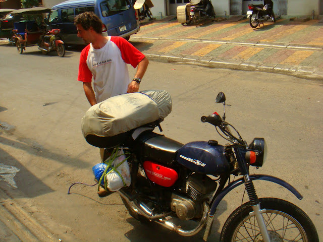 Le lendemain en me levant, Eric n'est pas là mais je tombe sur l'australien de la veille. On part prendre le petit déjeuner ensemble. Il me parle un peu de sa vie, de comment après une vie qui a volé en éclat en Australie il se retrouve à vivre avec une cambodgienne ici. Il a l'air heureux. Il en profite pour me donner des infos pour la prochaine ville où je vais pour trouver où dormir et où manger dans un endroit sympa, il en profite aussi pour me donner des infos sur comment aller en Australie et les formalités à remplir, future destination dont je devrais me préoccuper dans les mois à venir et qui n'est pas un simple voyage, c'est juste traverser l'océan pour aller sur un nouveau continent totalement inconnu. Mon plan est d'aller à Bangkok et de là prendre un vol pour Sydney ou ailleurs. Bref aucun plan, je sais même pas si avec juste un billet aller on peut entrer dans le pays. Il me file le site de l'ambassade australienne. On retourne à l'hôtel et je vois Eric et Srey Neng qui sont là. Il a du partir la chercher sans doute. Ils sont à la réception et Eric semble bien fatigué de tout ça. Il tente de s'arranger avec les gars de l'hôtel pour que Srey viennent ici pour récupérer l'argent qu'il enverrait et que les gars de l'hôtel s'arrange avec elle pour qu'elle aille bien en cours et s'en sorte par un autre moyen. Eric à l'air exténué car j'ai l'impression qu'il est le seul à se battre. Les gars de l'hôtel sont d'accord pour aider mais semblent résigné à ce que rien ne change quant à elle, elle a juste l'air paumé et il y a fort à parier qu'elle ne voit jamais la devanture d'une école et reste dans ce milieu de prostitution qui l'a happée et ne la lâchera sans doute pas comme ça. Eric le sent et Eric aime beaucoup Srey. Avec tout ce qu'ils ont parlé il ne supportent plus l'idée qu'elle retourne là dedans surtout qu'elle ne fait que commencer et n'a pas encore été salie par le métier. Le deal semble clos, Eric écrira à l'hôtel pour savoir ce qu'il en est, comment s'arranger et il reconduit Srey là où il l'a trouvé. De retour à l'hôtel il plie bagage, fixe le tout sur l'arrière de sa Minsk, il me rappelle les grands départs à moto du matin. Il est déjà tard, il pourrait presque partir demain mais je sens qu'il a hâte d'être seul sur la route et de se vider la tête de tout ça juste à penser d'arriver quelques part avant la nuit et de profiter des routes ensoleillées. Sa prochaine destination était à pas moins de 6heures de moto de là et lui dit qu'il est peut être un peu tard pour partir mais c'est le moment pour lui de prendre la route. Nos chemins se séparent de nouveau. Il part pour Siem Reap puis de là il ira sur Bangkok et traversera la Thaïlande. Moi il me reste tout le pays à découvrir. On ne risque pas de se voir de si tôt. Notre prochain endroit terrestre où on risque de se retrouver serait l'Amérique du sud. Alors on se donne rendez vous là bas comme si c'était la porte à côté, après tout le courant de nos vies nous y emmèneront dans les prochains mois. Reste à savoir si on y sera au même moment. Pendant qu'Eric finit de mettre ses sacs sur le porte bagage, et après avoir parlé sur où aller avec les gars de la réception, je décide de partir le midi même pour le sud et les plages de Sihanoukville. Destination coup de tête et qui fera que dans une heure je plierais bagage moi aussi et que dans 5 heures je serais ailleurs, sur les plages du golfe du Siam.