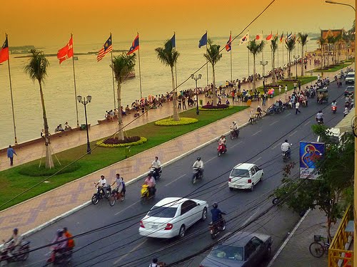 Accoudé à la rambarde du FCC on peut voir comme une promenade des anglais bien pavée où des mats portent tous les drapeaux du monde et qui flottent au dessus des motorbikes qui se croisent de concert à longueur de journée dans la rue, là juste sous nos yeux tandis qu'on sirote notre "Angkor" beer.