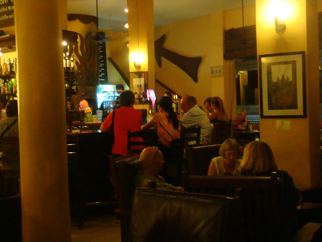 On décide de faire une bonne action et d'aller manger dans un restaurant qui aide les enfants des rues en leur apprenant les métiers de la restauration. Le Friends dans la rue 174, deux rues derrière le FCC. Ce restaurant en question, paraît il sert une très bonne cuisine et permet à ces jeunes de travailler. Et on y mangea très bien. On y rencontra un français qui passait quelques jours de vacances dans le coin. Avec Eric ils parlent du S21, un lieu de torture ici dans la capitale et des ossements qui témoignent du massacre de la population par les khmers rouges. Eric et lui l'ont vu et me disent que c'est l'incontournable du Cambodge pour ce qui est du témoignage de l'horreur passée et que c'est assez impressionnant. Je prends note et irait un prochain jour.