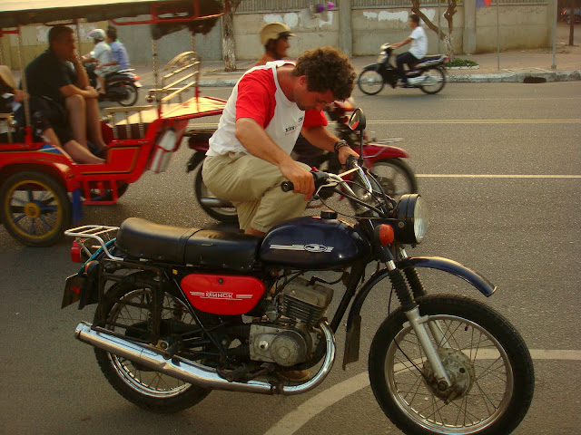 Mi fatigués des nuits de Phnom Penh et mi enjoués de continuer l'aventure ailleurs et de reprendre la route, on se dit au revoir sans être triste. Juste le son de la Minsk sonne la suite de l'aventure. Dernier signe de la main avant de tourner au coin de la rue et de disparaître. Il ne reste plus que le bruit du moteur qui s'épuise au loin en guise de souvenir puis le bruit de Phnom Penh reprend ses droits.