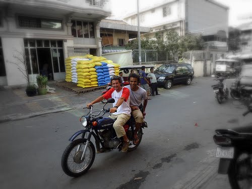 Au loin avec sa chemise du samedi soir, Eric m'adresse un signe et je le rejoins lui et deux bières qui n'attendent qu'à être bues pour célébrer nos retrouvailles. Nos cheveux ont poussé, le teint est plus bronzé et le regard plus éthéré. On s'installe sur le balcon là où on s'accoude à la rambarde pour voir le Mékong couler juste en face de nous. Le FCC signifie le Foreign Correspondance Club, c'est à dire là où pendant la guerre les journalistes étrangers se réunissaient. Le lieu a gardé l'allure d'époque et les étrangers qui boivent leur verre dans ces fauteuils en rotin et leurs habits en lin ont l'air de descendants coloniaux. La vie aisée entre occidentaux tandis qu'en bas le cambodgien tente de survivre dans cette ville asiatique où on gagne trois fois rien. Je suis par chance de ma naissance du bon côté de la rambarde à boire cette bière et raconter mon monde tandis qu'Eric me raconte le sien. On se raconte comme deux vieux motards nos délires à deux roues et on se rend compte qu'on a vécu les même sensations, le fait de devoir rouler pour arriver avant la nuit, les routes qui n'en étaient plus, nos chutes etc… Eric me dit qu'il a traversé le nord du Vietnam, le Laos et le Cambodge et qu'il part demain pour la Thaïlande. Plus de 4000km sur sa Minsk. Une vraie histoire d'amour et il pense même à la garder et l'envoyer par cargo en France. Faudra juste qu'elle passe les mines ce qu'on doute fort. Mais comment abandonner une si bonne compagne de route ? En comparant nos routes, on s'aperçoit qu'on était à Dien Bien Phu le même jour où à un jour prêt. En gros le soir où je suis arrivé, était le jour où il en était parti. Ca aurait été bien bizarre de se voir par hasard sur nos bécanes ce jour là, moi après 400km et lui au devant de plus de 3000 !! Alors on parle et on se reprend une bière. Il me dit qu'un jour il s'est pris un tas de sable en roulant et que lui et l'amie qui était à l'arrière se sont crashé. Faut dire que les tas de sable surgissent parfois en plein milieu d'un virage si ce n'est un trou où toute sorte de travaux. Une chance que se fut un tas de sable et pas un tas de cailloux. Mais les chutes font parties des histoires à moto.