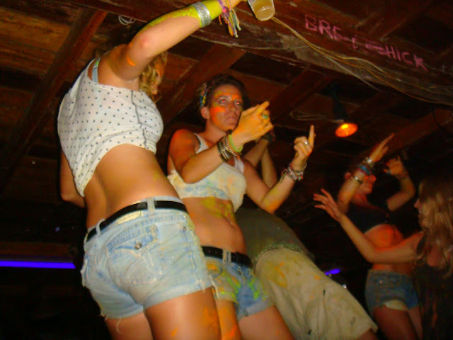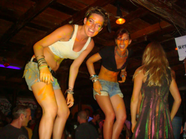 Les barmen et barmaids s'amusent plutôt bien, bande de voyageurs qui pour se payer leur nuit travaille dans le bar de l'hostel. En tout cas ils doivent boire autant que nous. Soudain les serveuses montent sur le bar et improvise quelques petits pas de danses toutes peinturlurées.