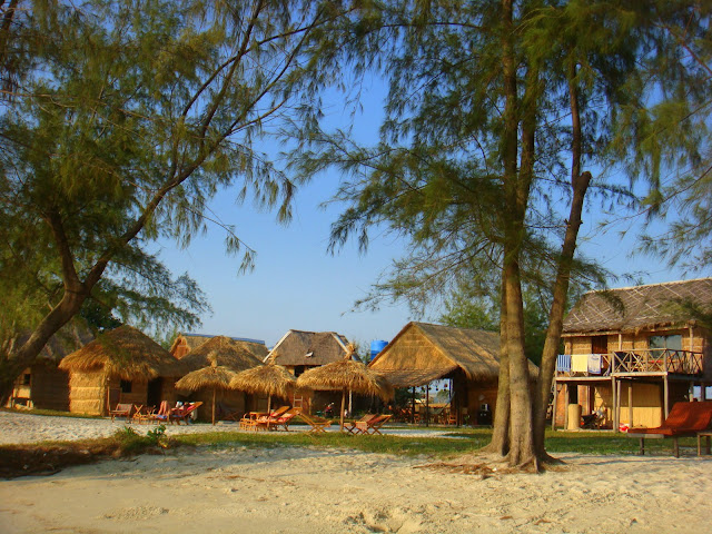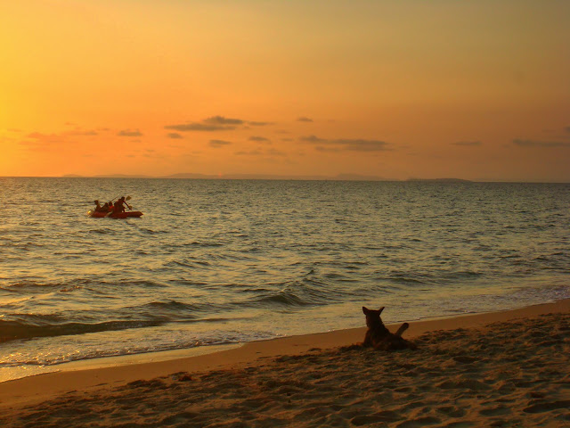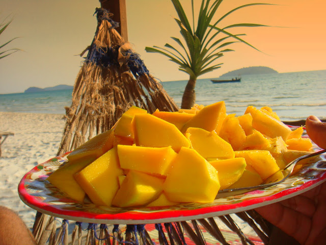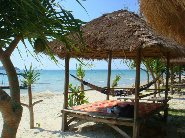 Pas de doutes, venir ici demande un peu plus de temps que pour aller à Ochheuteal Beach et la clientèle à l'air plus baba cool. Hamacs, plage vide de touristes mis à part quelques uns qui prennent l'ombre et quelques bières en regardant passer le temps. Je vais tout au bout, là où pour le coup y a plus un seul touriste. Une petite famille tient un bar. Je commande une salade de fruits et me pose sur un hamac pour lire. Ainsi passa l'après midi.