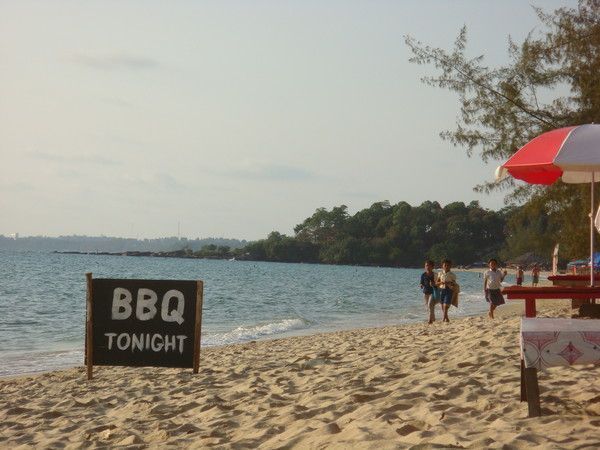 On parle les 4h qui nous séparent de la côte et quand on arrive au terminal de Sihanoukville on monte sur des motorbikes qui sont attroupés à notre descente et nous font le taxi jusqu'à la plage d'Ochheuteal où on pense prendre l'hostel. Celui qui me fait monter à l'arrière de sa moto me demande si la demoiselle est ma copine. Je lui dis que non on s'est juste rencontré. Il me dit qu'il connaît les femmes et qu'elle n'a qu'une envie, sortir avec moi !! Je le remercie de son conseil et lui demande de m'arrêter à la superette pour que j'aille acheter de la glue (rien à voir avec ce qu'il vient de me dire). En effet après les longues ballades dans les collines avec mes vraies fausses sandales, la lanière qui va entre les orteils s'est décousue et ma seule façon de m'en sortir est de coller la lanière à l'intérieur de la semelle. Quand on achète du faux, la glue est la chose qui vient juste après pour faire durer un peu plus les choses. Els me dit de prendre une chambre à l'hostel où elle a réservé au bout de la plage. Quand j'arrive toutes les chambres sont prises alors je vais à celui que me conseille mon chauffeur, le GST guest house, 100m en amont, le moins cher du coin. En effet j'y ai une chambre pour 4 euros et une fois mes affaires déposées et m'être un peu délassé du trajet je pointe mon nez dehors. Hostel tout simple mais qui est à 50m de la mer. Juste traverser la route et on y est. Je vais passer la fin de l'après midi sur cette plage où pas mal de ventres et de dos encore bien blancs tentent au choix de rougir ou de bronzer. C'est la plage où on trouve des bars et des petits restaurants, des fauteuils en osier avec de gros coussins pour siroter son verre en regardant le soleil se coucher, bref la plage sympa avec son lot de touristes mais pas trop (on n'est qu'en février). La nuit va pas tarder à tomber, alors je me dit que je ferais bien la soirée suivante : manger un barbecue de poissons comme il y en a partout sur la route et le bordure de plage et boire un coup dans un des bars de la plage ensuite. Je devrais y revoir Els car c'était les plans dont elle m'avait parlés dans le bus et comme je pense que c'est la seule attraction du coin à cette heure, on devrait s'y retrouver.