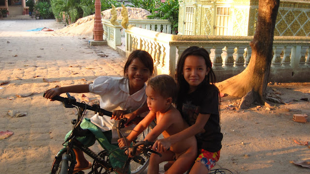 Journée bien remplie et c'est avec plaisir qu'on se laisse aller sur nos engins. J'ai besoin de tirer de l'argent pour payer mon séjour ici. Mister Mot me propose de me déposer au distributeur du coin car il est pas facile à trouver. Le chemin qu'il prend, nous fait aller loin, et il me dit qu'il n'y a que deux distributeurs dans la ville. Manque de bol la machine devant laquelle on arrive est en train d'être réparée et on attend. Mister Mot me parle de ses amours et de son amour australien qui est d'une jalousie maladive. Alors on parle un peu de sa copine lointaine. Une fille qui est tombée amoureuse de lui et qui lui mène la vie impossible. D'ailleurs il l'appelle. Il est amoureux, mais pas heureux. Le coup de fil qui suit en est une démonstration. Engueulades, mots doux, engueulades, il menace de raccrocher, lui dit qu'il ne la trompe pas, semble écouter une longue diatribe, s'énerve. Il me rappelle certains de mes coups de fils d'antan. Une fois qu'il a raccroché, on parle un peu, je lui dis de pas rester avec une fille qui ne le rend pas heureux et qui lui mène la vie infernale surtout si ils ne se voient jamais. Le téléphone re-sonne, second round. J'ai toujours pas mon argent, lui a perdu de sa superbe et semble dépité, j'ai plus trop envie de parler de sa copine et lui dis que j'aimerais au moins manger avant que tout ne ferme. Il me dit qu'il m'invite à manger chez lui, qu'on a qu'à rentrer ensemble et qu'il me présentera sa famille. Alors on part à travers la campagne pendant quelques kilomètres, route nocturne à la lueur des phares avant d'arriver à une maison que je n'avais pas même distinguée. On entre, et sa famille me regarde avec intérêt et toujours cet accueillant sourire. Je découvre les jeunes enfants de Mister Mot et j'apprends qu'il est donc papa. Son père est assis contre le mur et regarde la télé avec eux. L'un d'eux est un peu malade. Je vois les photos de sa copine australienne avec qui il a été jusqu'en Malaisie. Elle lui a offert le passeport. Sa famille demande d'où je suis, je répond de France, mais il font une drôle de tête. Je comprends que pour eux un français est blanc et non coloré. Alors j'explique le métissage qu'on rencontre en France, et Mister Mot traduit à ses parents qui font des grands signes d'étonnement et d'acquiescement. C'est un peu comme si j'apprenais qu'il y avait des cambodgiens noirs. Ce soir ils ont appris quelque chose qui a fait voler leur croyance en éclat. On s'échange plein de sourires tandis qu'on mange assis par terre, une bonne gamelle de riz avec de la viande et une soupe aux délicieux légumes. Les enfants, les grands parents, me regardent, je suis leur invité d'honneur. Sur une table j'aperçois un globe terrestre. Je m'empresse de le prendre et de leur expliquer tel un astronaute venu de l'espace, le chemin que j'ai parcouru et qu'il me reste encore à parcourir. Je vois que je suis vraiment qu'au début d'un long voyage.