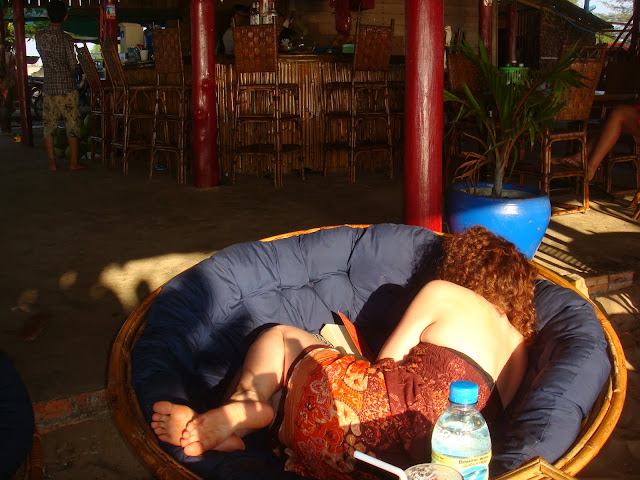 Jour sans, sans grandes envies que de se laisser écraser par la chaleur et d'économiser ses efforts. Et puis ça tombe bien on est un peu crevé. On va sur la terrasse en haut de notre hostel, là où on peut manger ou juste se poser sur quelques canapés. Chacun le sien, on lit, on écrit, on tente de dormir ou de regarder le DVD qui passe. Robyn et Treasa apparaissent et zonent avec nous. Treasa dort, Robyn écrit, les flammandes aussi et moi je tente de tout faire en même temps, dormir, écrire pour finalement ne rien faire. Classique !