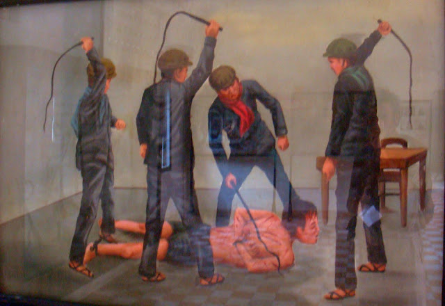 Un homme ou une femme, attaché, torturé, en sang (les tâches sur le sol) qui devait avouer un crime. S'il ne l'avouait pas, il était torturé jusqu'à ce qu'il avoue. S'il avoue, il est condamné à mort ! Les photos sur le mur montrent des chairs sanguinolentes et un être humain qui n'en est plus.