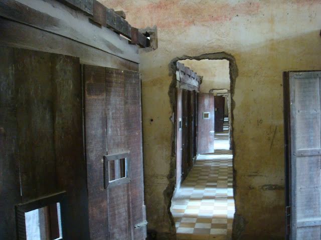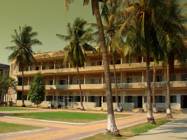 C'est bizarre aussi en arrivant tout proche de l'école de voir ces quartiers où les gens vivent et vivaient, témoin de cette horreur qui doit encore hanter la mémoire de ces rues et de ces habitants. Cette école s'appelait Chao Ponhea puis fut rebaptisée du nom de Tuol Sleng, qui voulait dire en khmer, la colline des arbres empoisonnés puis transformée en centre d'interrogatoire, le bureau de Sécurité 21 : le tristement célèbre S-21. Entre 1975 et 1979, plus de 17000 prisonniers y transitèrent et seuls 7 ont survécus. La totalité d'entre eux étant mort de tortures pour avouer des crimes qu'ils n'avaient pas commis ou tout simplement exécutés (après quelques tortures).