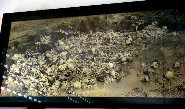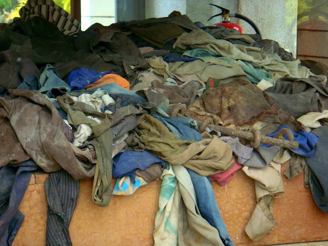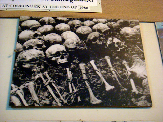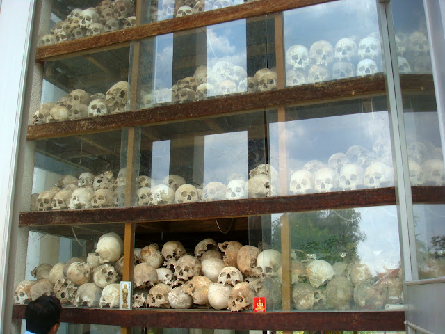 Bref l'horreur interpelle notre imagination, car bien entendu aujourd'hui, il ne reste que des écrits et des photos pour nous témoigner ce qui se passait entre ces murs. Au bout de deux bonnes heures, on part vers les killing fields, le camp d'extermination, où un mémorial nous acceuille. Ce mémorial est une sorte d'obélisque en verre où sont exposés des centaines ou des milliers de crânes trouver lors de l'excavation des ossements. Quelques habits sont exposés, le reste sont des os.