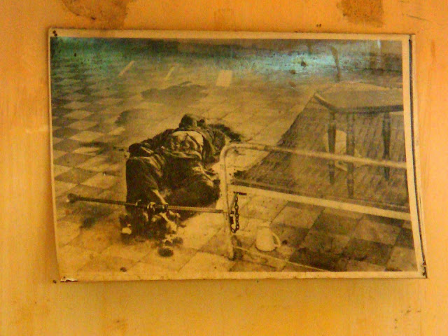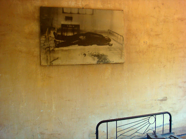 On commence ainsi la visite de l'école ou de S21, avec la même ambiance que si on visitait un cimetière. Tout est vide, mise à part dans quelques salle avec un lit, juste un lit et une petite caisse et des tâches sur le sol. Une photo sur le mur montre ce qui se passait sur ce lit.