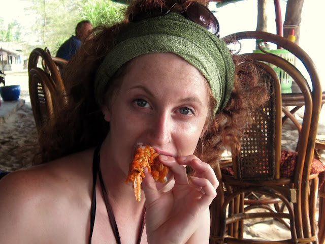 Je dis à Els qu'on était à sa plage préférée, à Otres beach. Elle nous dit qu'elle aussi y était, mais on ne s'est pas vu. Elle était à un bungalow à boire quelques bières en regardant la mer. Nous étions 300m plus loin. Comme on a rien à faire et que cette plage nous plait bien on hèle un mototaxi et on y retourne. Els me demande si j'ai mangé les fameuses gambas dont elle me parlait dans le bus. Je lui ai dit que non. Alors on en commandera.