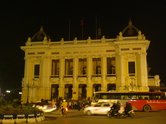 On part ensuite dans un bar très classe dans un des hôtels de la ville qui est juste à côté. L'endroit suggère les mots, luxe calme et volupté. On se commande un chocolat, un thé et un irish coffee. L'endroit est justement plus leur tasse de thé et en prime on voit la ville d'en haut. On est au 3ème étage. Ils me disent que la prochaine fois de venir dormir chez eux, ils ont une grande maison et de la place. Mais je ne reste plus très longtemps sur la ville et de là à revenir ici, il faudra plusieurs années et qui sait où ils vivront cette fois. Je leur dis que demain je fais la visite de l'hôpital de Hanoï pour mon rappel anti rage. Cathy qui travaille dans le milieu médical me dit que pour mon vaccin, si je n'ai pas de carte d'expatrié, je vais douiller et payer quelque chose comme 70 euros au bas mot !! Quoi ! pour une piqure et ce maudit chien !! Elle me dit de dire que je l'ai oublié et peut être de ne payer que 20%. J'apprécie le tuyaux. Ca vaut bien le coup d'économiser un euros chaque jours pour les claquer bêtement. Je verrais bien demain. Le serveur arrive avec nos boissons aux fumées odorantes. On savoure nos cafés et chocolat et on finit de passer une très agréable soirée, on parle de tout et de rien, du soucis d'être parent, du plaisir de voyager (et vice versa). On est les derniers clients et on sent qu'ils attendent pour fermer. Ils travaillent pas moins de 12h par jours alors on compatit et on rentre. Quand ils me ramènent à mon hostel, ils me souhaitent de continuer à bien en profiter. Je leur souhaite de même à ces éternels jeunes qui parcourent le monde en famille et en travaillant. Ils me disent de motiver leurs amis de venir découvrir Hanoi maintenant que je connais un peu. Ils sont plus qu'attendus. Je n'y manquerais pas. De mon côté je leur souhaite bon courage pour la suite avant de les s'en aller, mais pour combien d'années cette fois ?J'ai l'impression qu'être parents d'artistes en herbe ne doit pas toujours être une partie de plaisir. L'éternel conflit générationnel, les parents qui pour les enfants ne comprennent rien à la vie et les enfants qui pour les parents ne connaissent rien de la vie. Ils ont encore une fille plus jeune et ils n'ont pas fini je pense de devoir rester jeune pour comprendre une autre nouvelle génération.