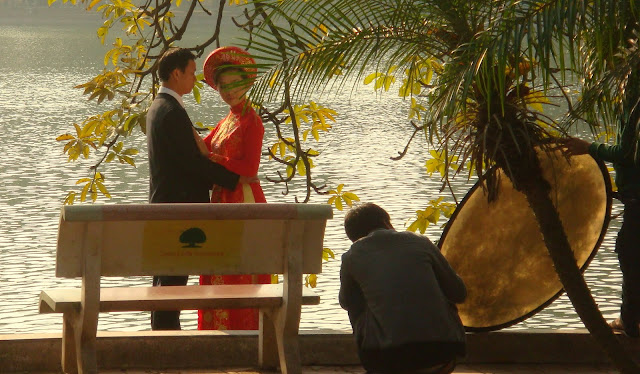 La journée ne fut rien d'autre que de profiter et de errer dans Hanoï. Je lis qu'une des choses pittoresque à voir sur la culture vietnamienne est un théâtre où se fait un spectacle de marionnette sur l'eau. Je regarde sur le plan, il est aux abords de la vieille Hanoï, au nord du petit lac. Je me balade le long des berges où je vois un couple qui pose pour des photos de mariage. La mariée dans une robe rouge en soie est magnifique.