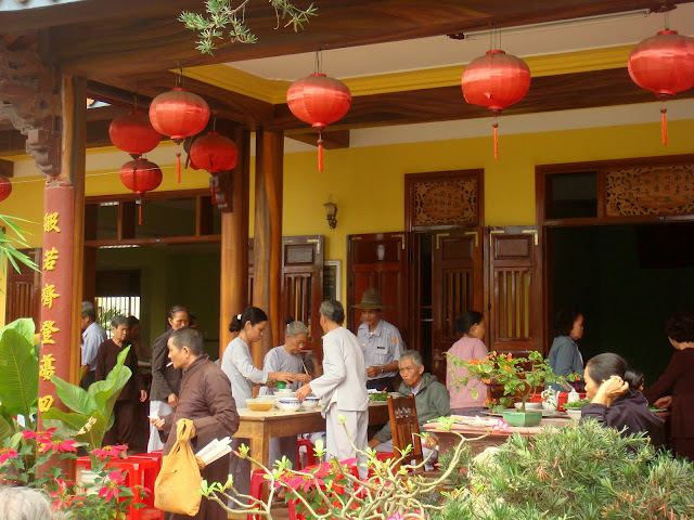 Le jour touche à sa fin, alors je me promène sur la jetée pour voir un peu l'animation de la ville, son marché. Un restaurant touristique affiche une carte alléchante où ne vont que les touristes. Pas cher dans l'absolu trop cher dans ma relativité. J'achète juste une chemisette dragon en lin et de style chinois qui me revient à 3 euros. Je me dirige vers le marché où on me propose de goûter quelques fruits et gâteaux inconnus et j'achète un paquet pour les remercier. Je pars ensuite à la recherche de ce restaurant végétarien que l'on m'avait recommandé la veille. Et je le trouve et j'y mange et m'y régale pour pas grand chose. Le tofu remplace le poulet, les légumes sont un peu plus goûtus et il y a du monde. C'est une bonne adresse. La nuit est tombée et je retourne sur la place du marché profiter de l'air frais des affluents du Mékongs qui coulent juste à côté. Il paraît que si on se lève suffisamment tôt on peu voir les marchés flottants sur la rivière. Mais je ne les verrais pas, je ne me lèverais pas suffisamment tôt et de plus je ne reste pas. Il ne me reste que quelques jours avant que mon visa expire, alors dès le lendemain matin je me rends à la gare routière que l'on m'indique, non sans prendre mon brunch au restaurant végétarien, plein à cette heure mais on me fait manger dans leur salon attenant avec tous mes bagages un peu encombrant et on me sert même du rab. Privilège sans doute d'être venu la veille et d'avoir accepté de ne pas manger dans le restaurant bondés. Vraiment sympathique petite ville.