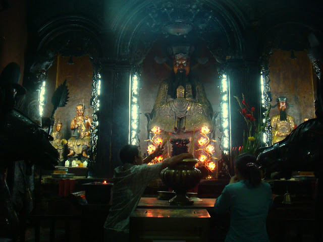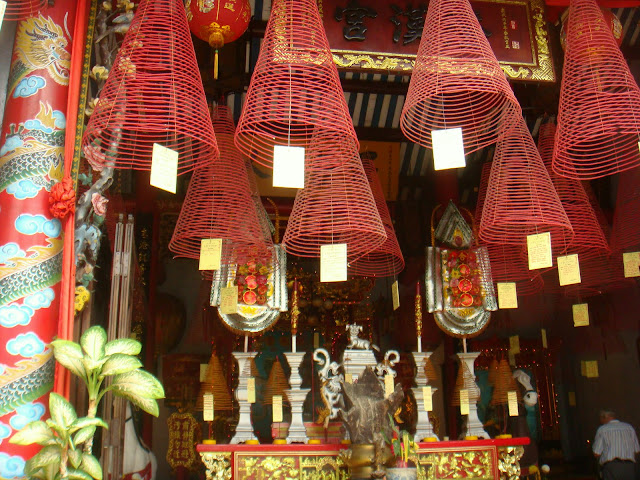 Je visite quelques unes et quelques temples aussi. Leurs ornements sont magnifiques. Dans certains des encens en spirale brûle et suspendu à cet encens, le nom des gens qu'on aime. Je l'aime bien cette ville. L'impression d'être hors du temps.
