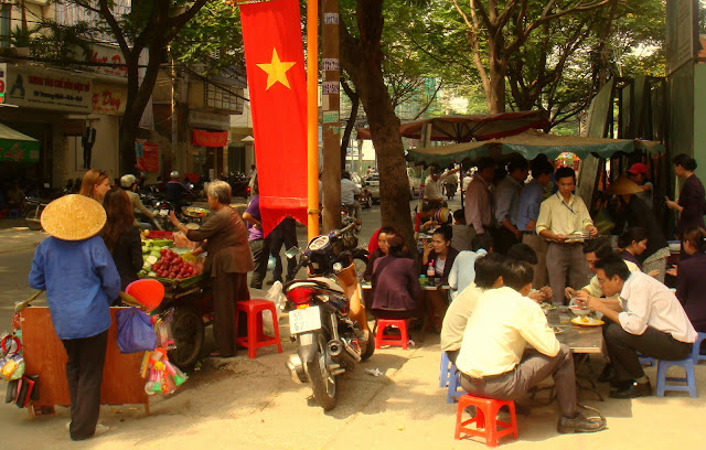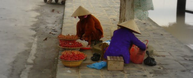 Enfin c'est à ça que ça m'a fait penser. Comme je ne l'ai pas retrouvé je retourne voir le gars qui vend les briquets sur le petit muret. Il est parti. On me dit de revenir demain. Le hic c'est que mon bus est à 8h du matin. J'espère que comme tous les vietnamiens, il commence sa journée aux aurores. Sur le chemin je m'arrête devant une cuisine ambulante tenue par deux femmes.