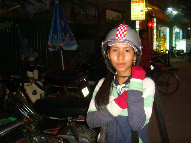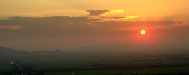 On retourne à l'hostel entre chien et loup. Il me propose de m'emmener manger à l'un des restaurant de rue où je suis sûr de trouver le meilleur plat au meilleur prix. J'en profiterai pour lui payer le repas pour le remercier de ses services. Longue route pour revenir, on double deux filles à l'arrière de motorbikes qui étaient elles aussi en haut de la montagne. Elle était bien belle cette montagne. Entre deux mondes, elle a du en voir des choses se passer. L'invasion du Cambodge par le Vietnam pour chasser les khmers rouges, l'entrée des troupes américaines qui étendirent leur guerre au pays voisins… là c'est juste un soleil couchant qui passait.