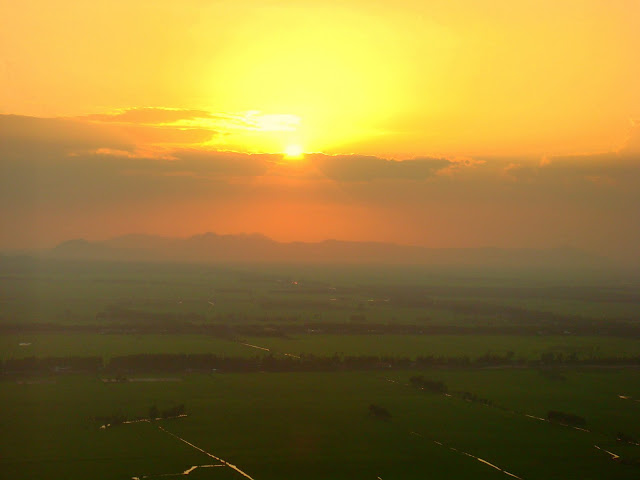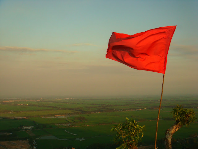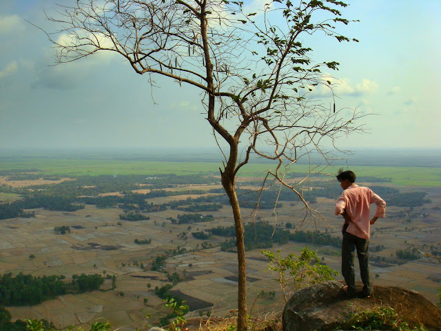 Je descends à l'accueil, le gars qui me proposait de m'emmener à un autre hostel, me propose de me faire découvrir le coin. Il est jeune et sympa, qui plus est, je verrais que l'hostel qu'il voulait me montrer fait partie de la liste de mon guide. Quand il me propose de me faire découvrir le coin, je me dis pourquoi pas ! Il me dit que l'une des choses à voir ici, est le coucher de soleil sur une montagne qui surplombe la région et qui fait face au Cambodge. Il me dit que c'est le bon moment pour assister à ce spectacle. Etre au Vietnam et voir le soleil se coucher sur le Cambodge. Je lui dis qu'avant je dois faire des photocopies de papiers et poster le tout à mon assurance en France. Les papiers de l'hôpital. Il me dit qu'il m'emmène à la photocopieuse et à la poste et ensuite on part sur la montagne. Vendu. Une heure après, après une rude montée, je me retrouve dans un hâvre de paix, entouré de rizières où l'on voit des chemins fuyants vers des endroits merveilleux d'après mon guide, qui me propose de m'y emmener demain si le cœur m'en dit.