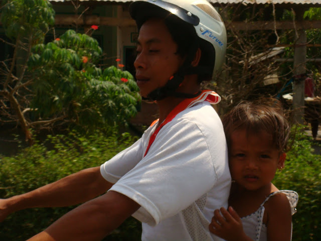 Je lui fais confiance pour le trajet, et on traverse petit village, on passe prêt d'un endroit où on négocie le poisson que l'on vient de pêcher dans les rivières. La pêche de ses poissons est un gros commerce ici. Un moment il me propose de conduire sa motorbike. Eh ! ça me fera des souvenirs, alors je prends les commandes et j'avais oublié comment c'est fatiguant pour l'avant bras de piloter ces engins, surtout quand on est deux dessus. Il me donne quelques conseils de conduite mais vois que je les connais déjà, comme klaxonner dès qu'on dépasse quelqu'un. Donc dans un concert de klaxon je roule une petite demi heure dans ces paysages de rizières et de champs avant de lui rendre les manettes.