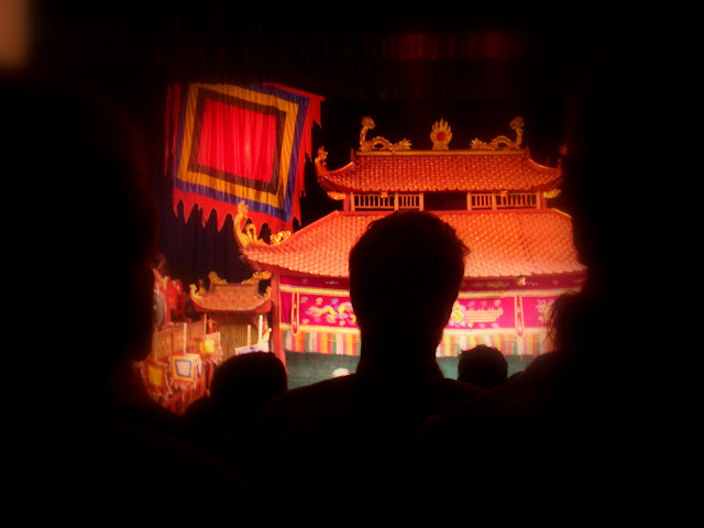 Le spectacle raconte les légendes vietnamiennes. En vietnamien, mais on peut comprendre car une dame entre chaque scène explique en anglais ce que l'on va voir. D'un côté de la scène un orchestre folklorique traditionnel et deux choristes qui font la musique et les voix de l'histoire. Ma frustration est que ce que je vois le plus du spectacle est la tête d'un gars 3 rangs devant moi, juste le plus grand de toute la salle qui me scinde la scène en deux et me cache le milieu. Assez énervant. Ah moins que ce ne soit la rage qui monte !!