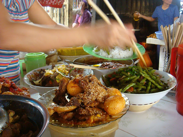 Je continue mon chemin et de retour dans cette fameuse rue de backpackers, je trouve un endroit pour manger, une promotion sur un assortiment de plats pour 4 dollars. Y a tellement d'échantillon de plats qui plus bien cuisinés que mes yeux et mon ventre sont émerveillés.