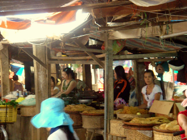 Les marchandes sont assises sur les étales et vendent leur viandes et légume. On peut aussi y manger. Il y a de tout, tout ce qu'on veut, sauf que la plupart des choses j'ignore leur goût ou comment ça se cuisine. Il vaut mieux demander qu'on nous cuisine tout sur place.