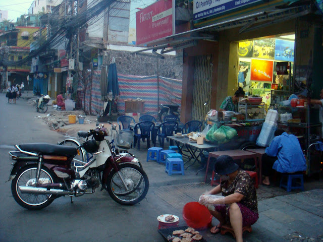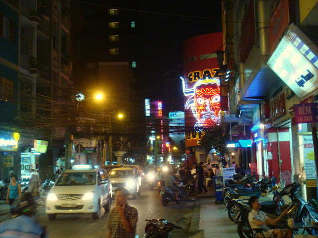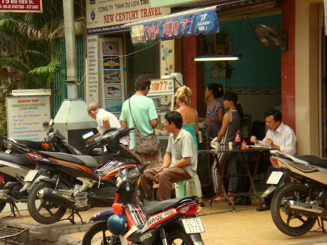 Je sors de la petite ruelle animée pour débarquer dans une grande rue animée. Bui Vien en plein cœur du district 1 (il y a 5 districts et 12 arrondissements dans la ville). Je vois des voyageurs, des gens attablés à une table ou en train de siroter un thé. Je vois une fille qui sort d'une boutique, habillée comme une hippie voyageuse, mais je sens qu'elle est française. Elle a ce truc dans sa façon de bouger. J'hésite même à l'aborder pour lui demander. Ca doit faire une dizaine de jours que j'ai pas croisé un français et la francophonie me paraît dès lors exotique. Mais je ne fais que la regarder passer et elle passe. En fait je suis dans le coin des hostels backpackers mais je l'ignore encore. Le bus nous avait laissé dans le meilleur coin de la ville pour trouver où dormir pas cher. Mais de nuit quand les rues sont désertes et qu'on nous laisse dans la rue parallèle, comment le savoir ? Je prends mon petit déjeuner habituel à base de rien de sucré ou de croustillant.