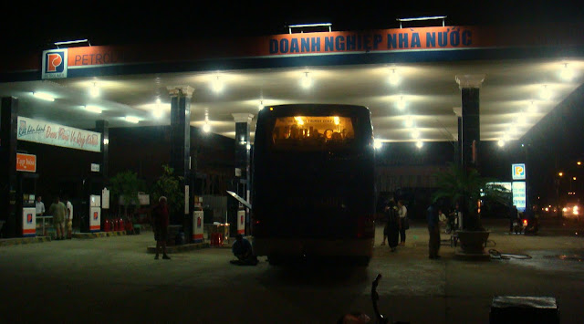 Je me suis préparer la parfaite soirée. Il est 20h et j'ai la nuit devant moi. Je me suis pris quelques paquets de biscuits pour la route mais surtout pour le film. Je mets l'ordi sur mes jambes et me regarde un film français, première étoile, avec des antillais qui vont au ski. Film bien sympa et agréable soirée puis je mets mon masque anti lumière et mes boules quiès pour trouver le sommeil. Je regarde et imagine le paysage qui défile. Je perçois les lumières de quelques lampadaires sur la route qui griffent les vitres du bus et quand c'est la nuit noire juste la lueur des phares que l'on croise. Nous voilà pour une longue nuit de bus. Juste à se laisser aller. J'espère que le chauffeur ne piquera pas du nez tout comme ces motorbikes et ces camions que l'on croise sur la route. C'est long une nuit à conduire sur les routes du Vietnam. Dans le bus, tous sont des voyageurs comme moi. A deux lits de moi une fille que je serais amené à revoir, tout comme la fille qui est juste derrière moi. Mais trop occupé à me passer ma petite soirée ciné gâteaux, je ne les remarque pas. A deux mètres de moi il y a les toilettes aussi, mais quand je veux y aller, la porte est bloquée fermée. Je pourrais pas tenir bien longtemps. Obligé de demander au chauffeur de s'arrêter en pleine nuit pour que je puisse me soulager la vessie.