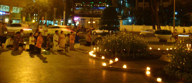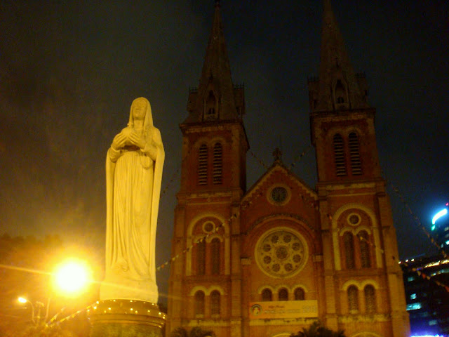 7 euros le verre, le même prix que dans un bar de Madrid ou d'ailleurs. En dongs et en voyage ça semble énorme de payer si cher pour si peu, mais quand je vivais en Europe, combien de verre de la sorte ai je payer juste pour passer la soirée entre potes sans même voir Saïgon de nuit en haut d'un hôtel 5 étoiles ? En redescendant je suis dans l'ascenseur avec un vieux couple qui semble aller à un gala alors qu'ils ne vont que manger au restaurant de l'hôtel au rez de chaussée et en sortant dans la rue, je croise une jeune fille au look bcbg plein de paquets à la main, revenant d'une après midi de shopping de luxe pour certainement moitié prix que dans son pays. Vu son âge c'est pas sa carte bleue qu'elle a du utiliser. Les vacances à l'hôtel Hilton avec papa et maman ont du bon. Dire que j'ai l'impression d'être plongé dans l'inconnu, luttant avec moi même, faisant attention à tout pour m'en tirer le mieux possible et en la voyant elle marchant d'un pas léger avec ses ballerines dorées comme sortant d'une rue huppée de New York, je me demande si on est dans le même Vietnam. Comme quoi tout est relatif. Ca pourrait être intéressant d'apprendre de son voyage et elle du mien. Ca ferait un peu belle et le clochard si on décidait de partager un plat de spaghettis ensemble pour parler de tout ça et pas sûr que l'ambiance des chambres nues et les soupes de noodles dans les petites ruelles la fasse rêver. Du moment que chacun en tire satisfaction y a pas de bonne ou de mauvaises façons de voyager. Peut être serais je même complètement surpris ! Je continue mon chemin et retourne dans les rues populaires et en repassant devant la cathédrale, un groupe d'hommes et de femmes chantent des chants religieux devant la statue de Marie.