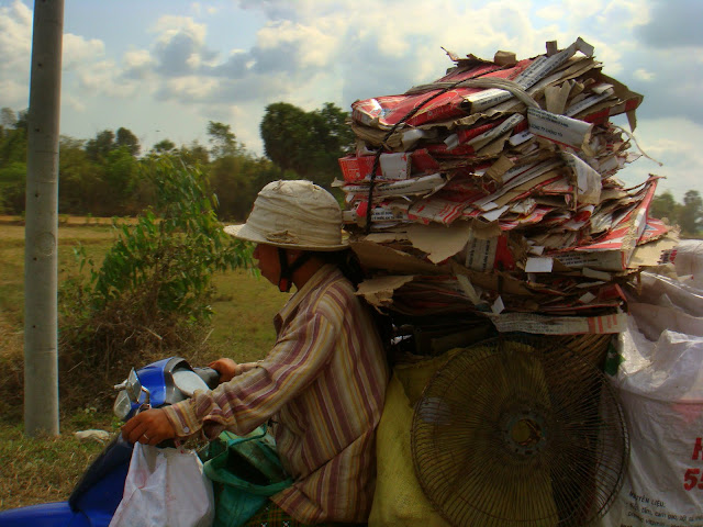 Je demande aux gens dans la rue, on me dit de prendre le bus numéro 1. Je le trouve, je paye et je m'assois paré pour quatre heures de voyage. 50 cents pour ce vieux bus de ville. Le trajet le plus économique du monde. Le bus traverse les districts moins touristiques de la ville, jusqu'au 5èmeoù on me dépose vingt minutes plus tard au milieu de rien. Je demande au chauffeur ce qu'il en est et il me dit que la station de bus pour Can Tho est de l'autre côté de la rue. Ce n'était qu'une navette et je dois me rendre au terminal de bus. A peine descendu du bus qu'une femme et un homme me demande si je vais sur Can Tho. Je réponds oui et me disent de monter sur leur mobylette jusqu'à je ne sais où pour prendre un bus. Je leur dis que c'est bon, je vais juste traverser la rue et prendre le bus normal. Mais ils insistent et me disent de les suivre que j'aurais un meilleur prix avec eux. Je me dis qu'ils veulent surtout me faire leur prix et profiter de mes dongs de touristes. Seul avec tous mes sacs je me sens pas en position de force pour quoique ce soit. Je les remercie mais leur dis de me laisser prendre le bus normal quitte à payer un peu plus (ce dont je doute forte). Mais ils continuent à me dire de monter derrière la motorbike et de les suivre. Pourquoi moi !! Ils peuvent pas me laisser prendre le bus comme tout le monde. En même temps je suis le seul à être descendu à cet endroit. Ils me proposent de m'emmener jusqu'à la station service à 100m d'ici. Malgré moi, je décide de leur faire confiance et je monte à l'arrière, me demandant quel est leur business. Là un van attend, avec des gens dedans et il reste une place. Ma place !! Le van va à Can Tho pour un peu plus cher mais plus vite et climatisé. Je dis que j'ai le temps pas besoin de tout ce confort. Mais comme partout, il suffit de parler pour engager la négociation sans le vouloir. Alors on parle de prix, je le descends, il le remonte, je le redescends, finalement comme il attend de se remplir avant de partir, on s'accorde sur le prix et je me laisser aller pendant deux heures et demi avec l'air climatisé jusqu'au cœur du delta.