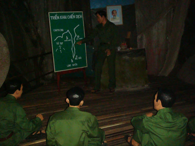 Les oreilles toujours sifflantes on retourne vers la sortie, il rentre chez lui, je le remercie, je lui tends un billet pour le remercier de tout ça et il refuse. Peut être travaille t'il ici, peut être l'a t'il juste fait en ami. Je ne sais pas. Je retrouve mon guide qui me demande si j'ai vu les caves. Je réponds par la négatif. Alors il m'y accompagne. On retourne vers les rochers, on tourne vers de petits escalier, ceux que j'avais loupé, et on descend dans l'obscurité. Tout d'un coup une ombre, un homme armé. Le cœur qui bondit, mais ce n'est qu'un mannequin pour décorer et que l'on distingue à peine dans la pénombre. On arrive dans une salle où d'autres mannequins sont en demi cercle devant un qui montre sur un tableau le déroulement des opérations. On s'y croirait presque.J'ai même presque l'impression qu'ils vont se retourner et me capturer.