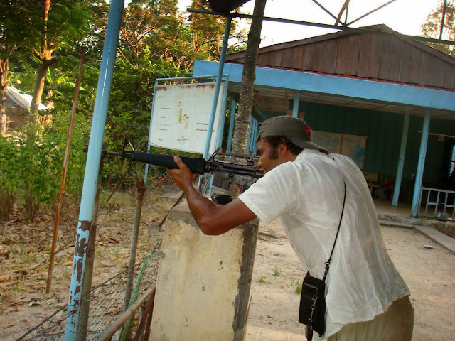 Mon guide doit se demander ce que je fais depuis tout ce temps. Quand je le retrouve il est sur un hamac à attendre. Je lui raconte ce que j'ai fait, et que j'ai pas vu l'ombre d'une cave. Il me dit qu'elles sont à l'entrée des rochers. Le jeune khmer qui m'accompagne me dit qu'il va me montrer. Sauf qu'il a pas du comprendre ce que je cherchais. On retourne dans le parc et me montre des autruches, des crocodiles dans un bassin, on va même tirer au fusil de guerre sur une cible pour 5000 dongs. Je lui propose de lui payer son tir, il ne veut pas. Il se met derrière moi et se bouche les oreilles. Je tire !